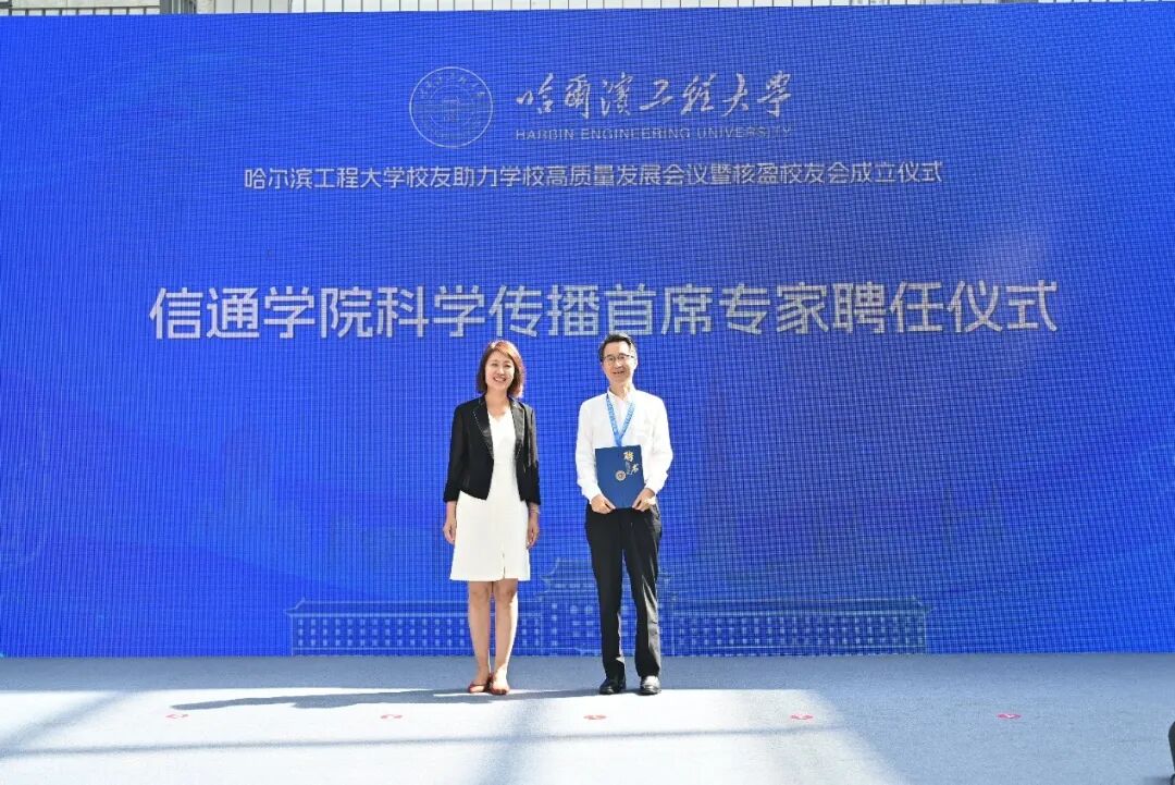 学院81级校友、新紫光集团董事、联席总裁陈杰被聘为信通学院科学传播首席专家。学院党委书记王锐为其颁发聘书。