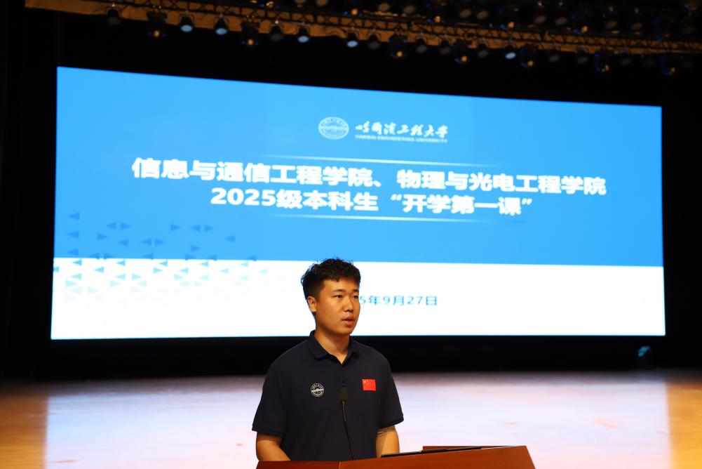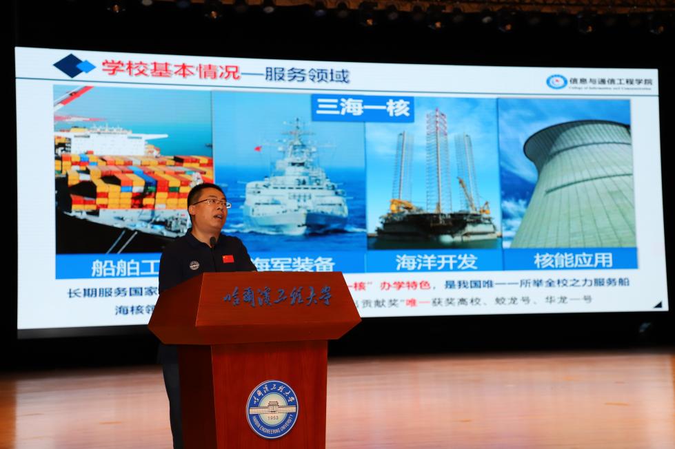 乔玉龙为新生们全面介绍了信通学院的深厚底蕴与卓越成就。他回顾了学院从“哈军工”海军工程系和导弹工程系一路走来的光辉历程,强调了学院服务国家“三海一核”战略需求的鲜明特色。他重点介绍了学院强大的师资力量、信息与通信工程和电子科学与技术两个一级学科的雄厚实力、国家级教学科研平台,以及电子信息工程和通信工程两个国家级一流本科专业的培养体系和目标。乔玉龙还生动展示了以“E唯”协会为代表的学生科创团队在世界水下机器人大赛等顶级赛事中屡获冠军的辉煌成绩,并分享了毕业生在升学深造和进入重点领域就业方面的优异表现,为新生们描绘了一幅清晰而高质量的大学成长蓝图。