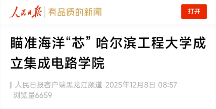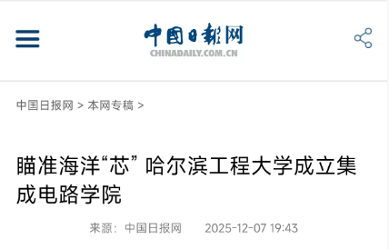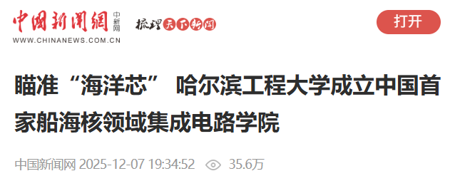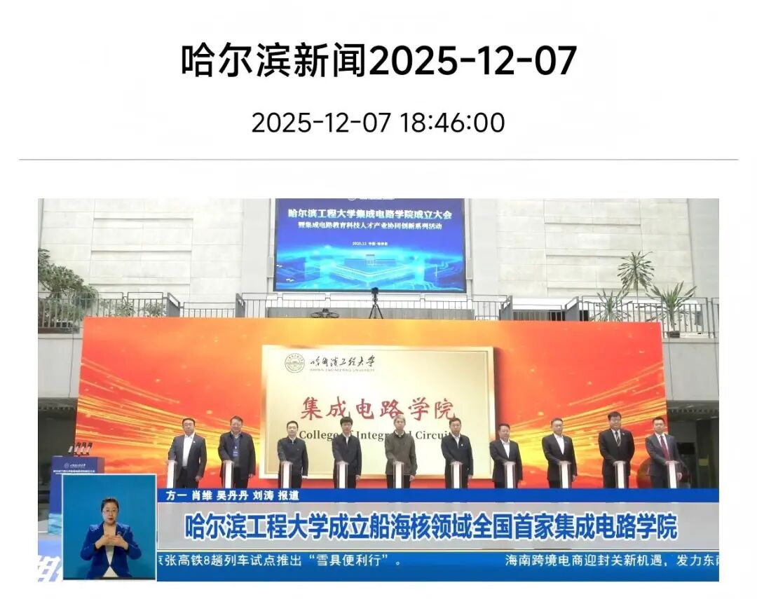 2025年12月7日,我校集成电路学院正式成立。央视新闻第一时间以《聚焦“海洋芯片”自主研发 全国高校首个船海核领域集成电路学院成立》为题进行专题报道,充分肯定学院在船海核特色领域的开创性意义。